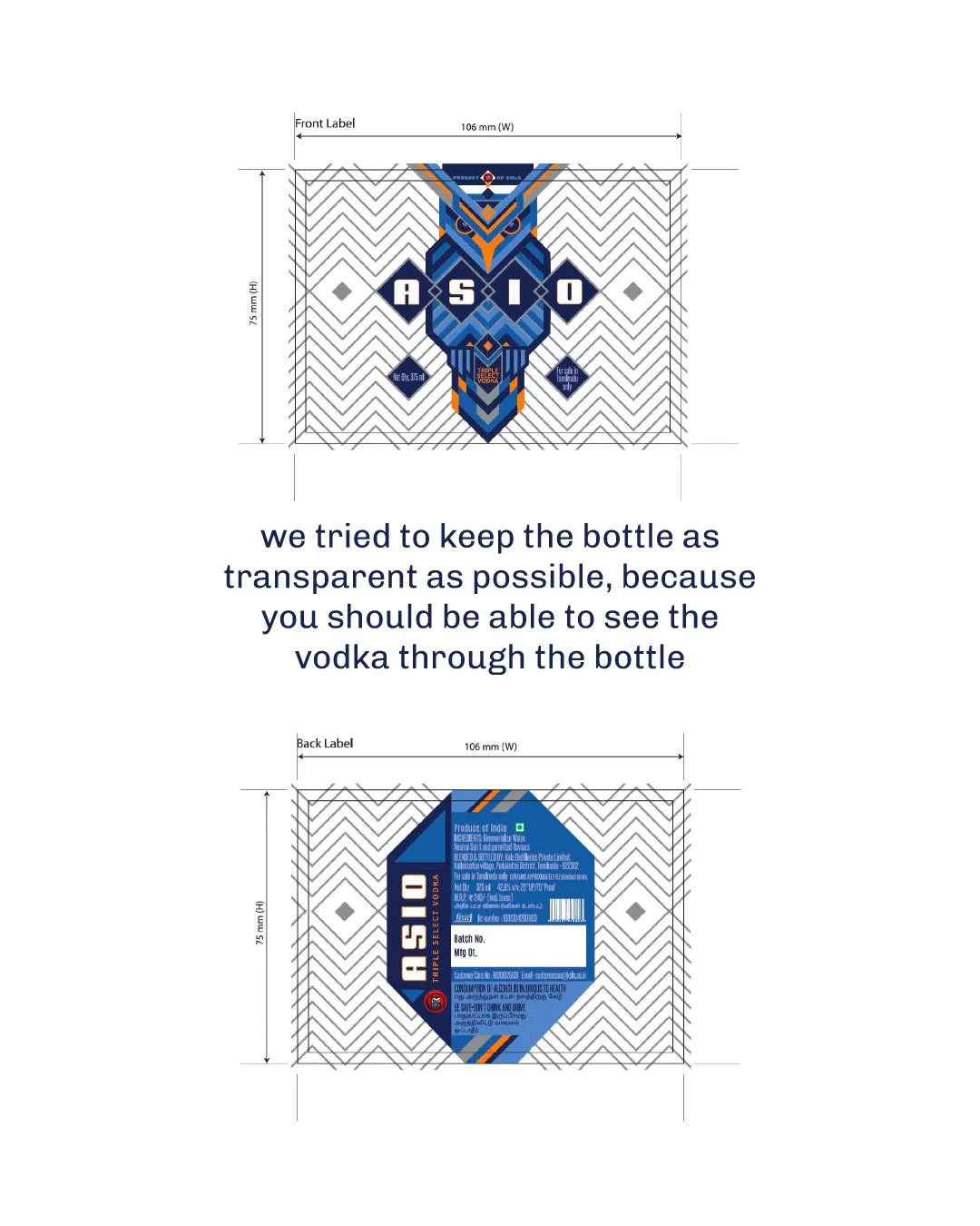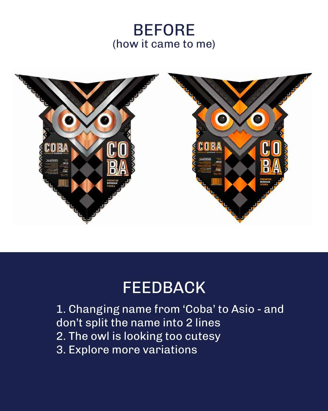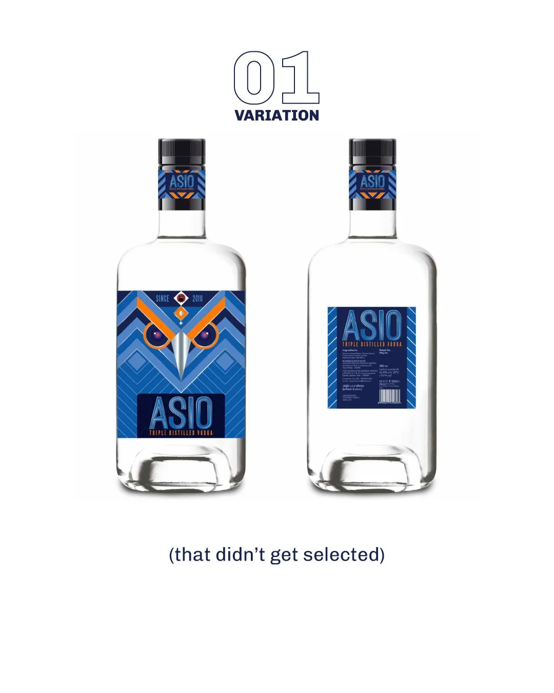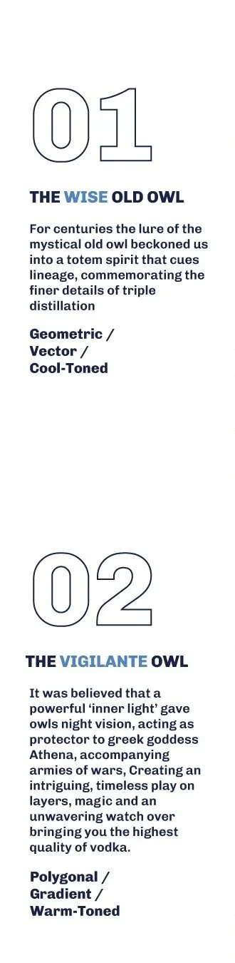 THE BRIEF / Reworking the first iteration To create a vodka bottle label that is unique and ownable. Primarily inspired by the representation of an owl, and qualities of the triple distillation process. SELECTED ♢ ♢